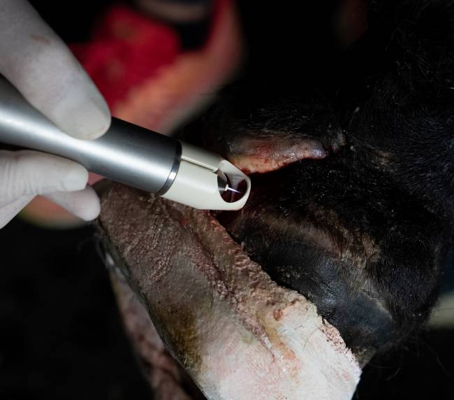 Die Intensivversorgung der Rehepatienten beinhaltet die analgetische Versorgung, Kryotherapie (Kältetherapie), entzündungshemmende Infusionen, und je nach Stadium und Befinden Hufverbände, Hufgipse oder spezielle Rehebeschläge. Als ultima ratio kann die Durchtrennung der tiefen Beugesehne erfolgen, eine Operation, die wir am stehenden Pferd durchführen.
